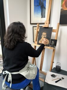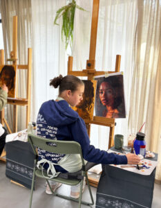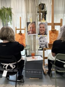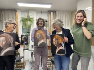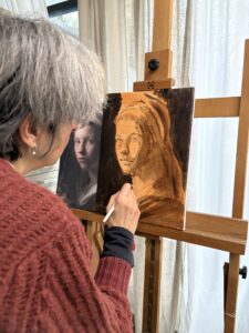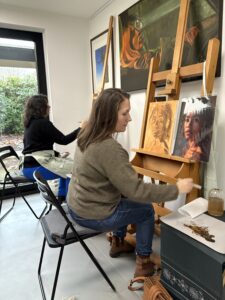 Ik heb bij Kim een workshop portret schilderen gevolgd. Voor mij was het een eerste kennismaking met acryl en met portret. Kim heeft ons in stappen naar een eindproduct begeleid: kijken naar vlakken, donker en lichte vlakken aanbrengen en overgangen maken. Iedereen kreeg persoonlijke aanwijzingen en langzaam ontstond het portret. Ik heb heel veel geleerd en vond het een heerlijke dag!